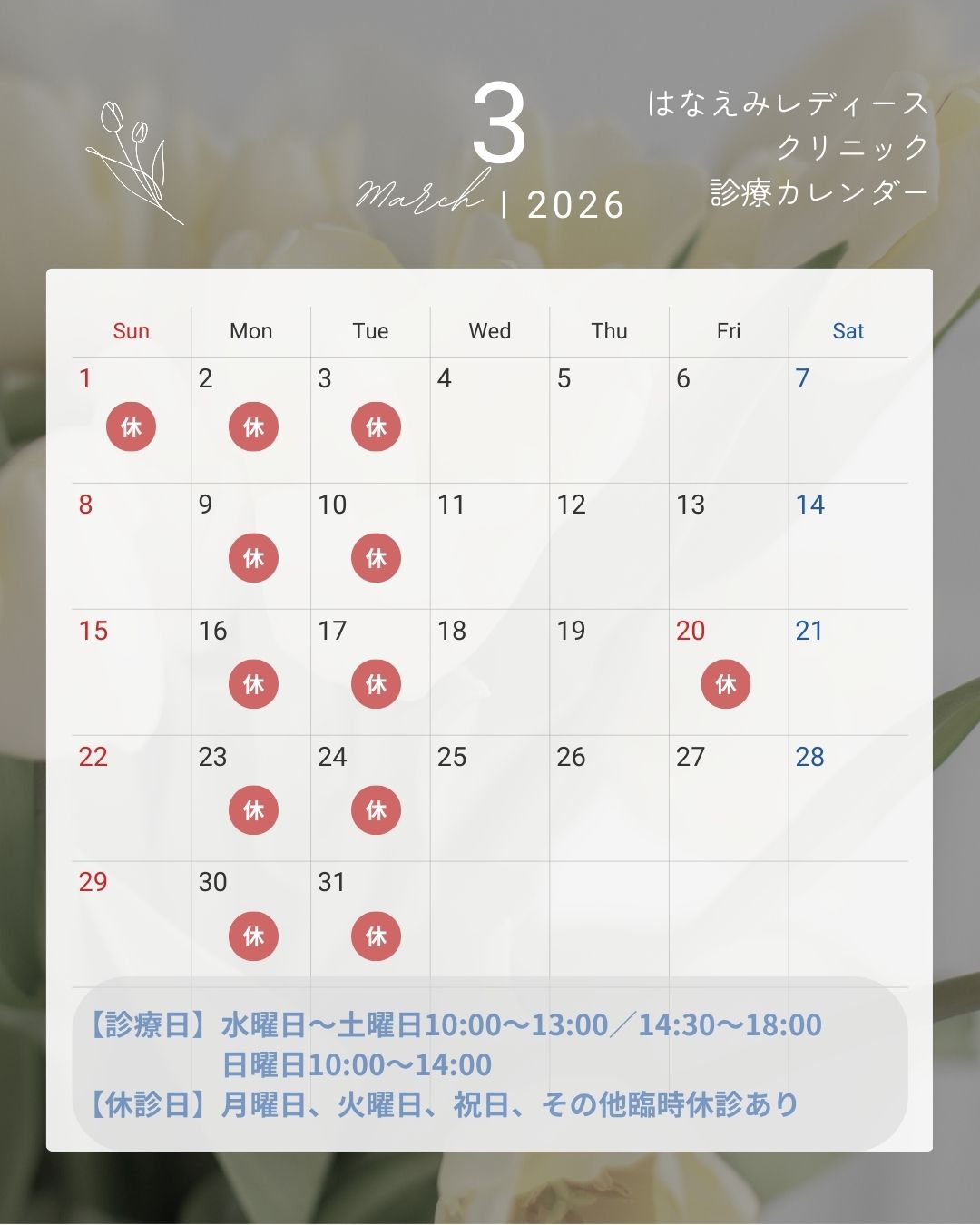 2026.1.28 Wed. 2026年3月臨時休診日情報 お知らせ 休診のお知らせ 3月の診療カレンダーとなります。 通常の休診日に加え、臨時休診日もございますのでご確認をお願いいたします。 ※2026年4月も臨時休診がある予定ですので、随時ご確認ください(未決定にて、後日更新予定)。定期処方薬継続中の方は、残薬のご確認をお願いいたします。 ご不便、ご迷惑をお掛けいたしますが何卒宜しくお願い申し上げます。 当院instagramはこちら