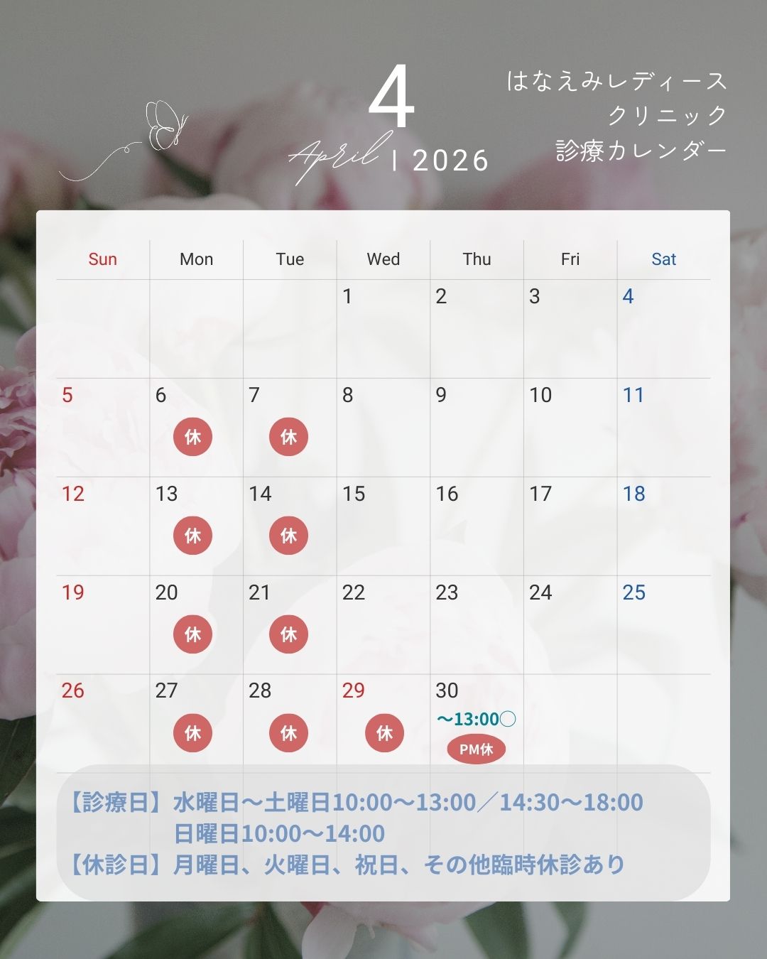 2026.2.21 Sat. 2026年4月臨時休診日情報 お知らせ 休診のお知らせ 4月の診療カレンダーとなります。 通常の休診日に加え、臨時休診日もございますのでご確認をお願いいたします。 ※2026年5月も臨時休診がある予定ですので、随時ご確認ください。定期処方薬継続中の方は、残薬のご確認をお願いいたします。 ご不便、ご迷惑をお掛けいたしますが何卒宜しくお願い申し上げます。 当院instagramはこちら
